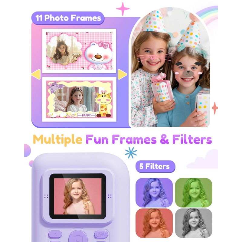 - Funny Camera for Kids: This kids instant print camera equipped with a 2.0" IPS screen, 12MP lenses and 1080P HD video recording, can clearly capture and record the world in your child's eyes. This kids digital camera also comes with 5 built-in scene filters, 11 photo frames and 6 stickers, providing kids with a variety of options to meet different needs. It is a good choice for accompanying children to grow up happily