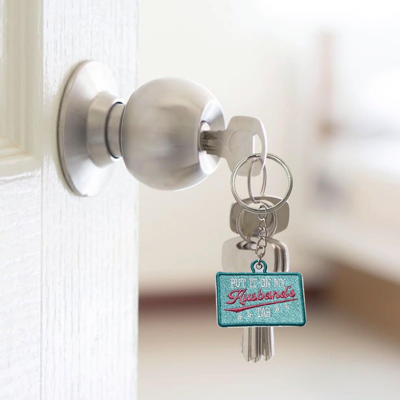 Put It On My Husband's Tab Keychain Patch 2.5 Inches Funny Quote Wife Life Sarcastic, Embroidered Fabric Keyring Patch for Backpacks Handbags, Purse, Car Keys, Key Charms DIY Accessories Gifts Mom Dad