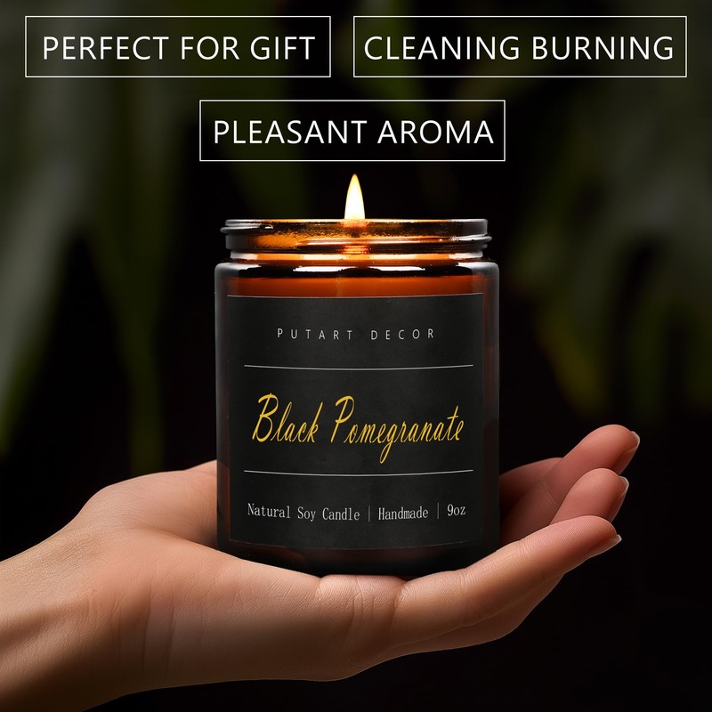 Putart Black Pomegranate Candles for Home Scented,Natural Non Toxic Soy Aromatherapy Candle Gifts for Women & Men, Strong Fragranced & Long Lasting Brown Glass Jar Candles with Essential Oils (9oz)