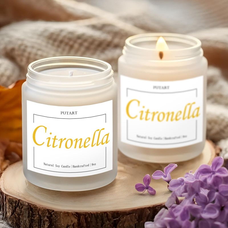 Putart Citronella Scented Candles for Outdoor & Indoor, Natural Non Toxic Soy Aromatherapy Candle for Home Patio or Garden, Strong Fragranced & Long Lasting White Jar Candles with Essential Oils 9oz