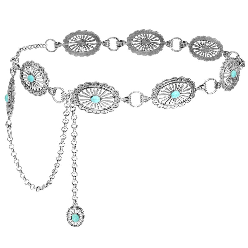 Metal alloy+turquoise concho, sturdy material and unique appearance. The western chain belt has a stylish look that doesn't look cheap and will last a long time.