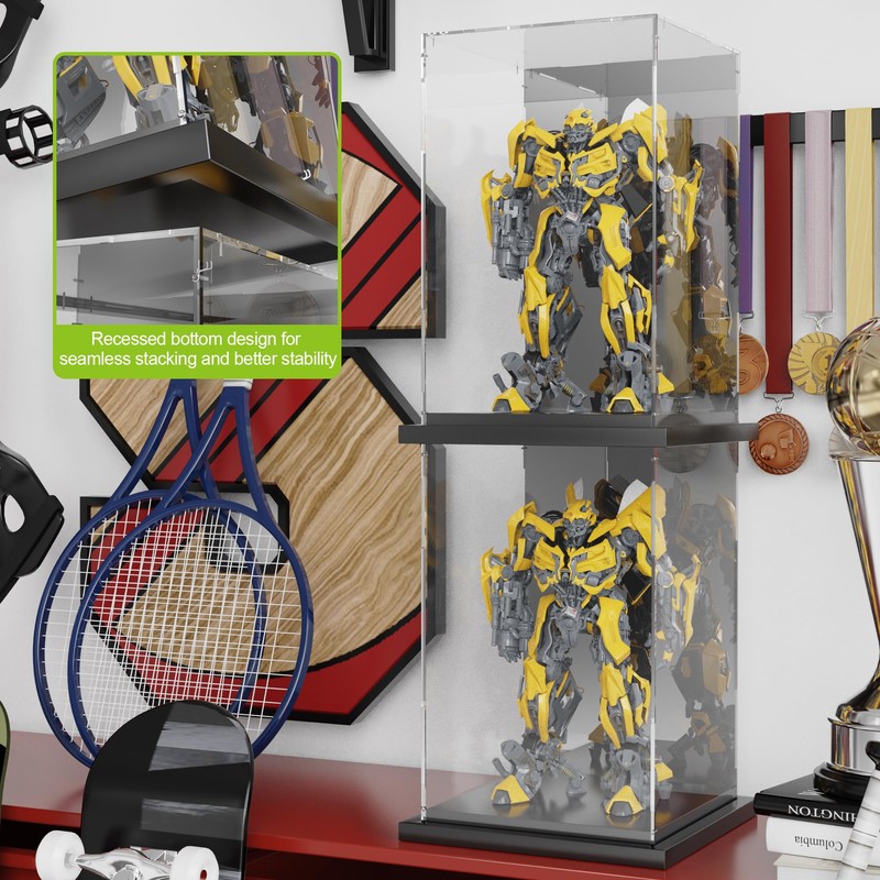 - 【Stackable Designs】The recessed design at the bottom of the base allows for seamless stacking and better stability, saving space and enhancing the overall visual appeal of your clear display case.