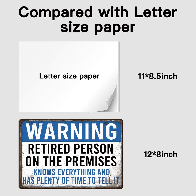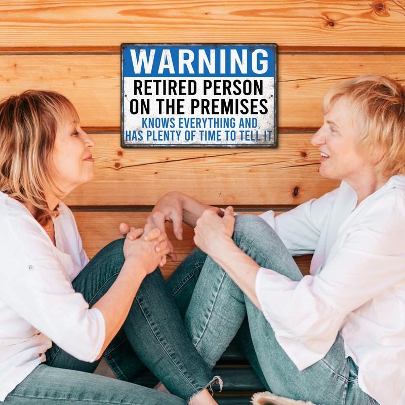 - The Putuo Decor Retirement Tin Sign is a humorous addition to any retirement celebration. Measuring 8x12 inches, it features the playful message "Warning: Retired Person On The Premises," making it a perfect gift for anyone embracing their newfound freedom.