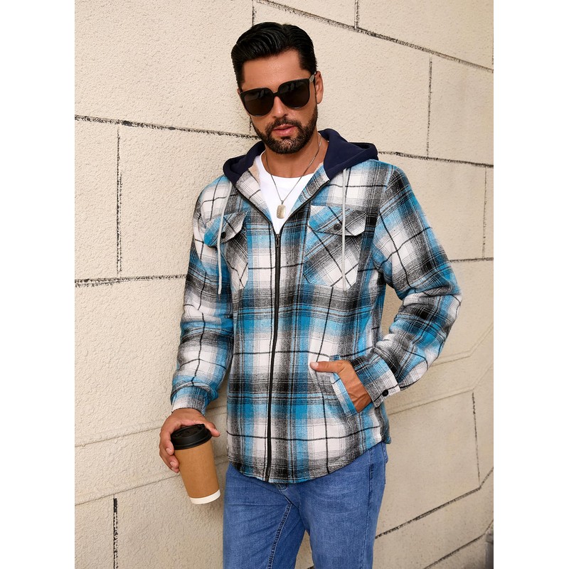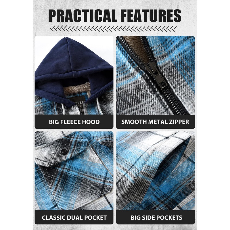 - Features: This Sherpa Flannel Jackets features full zip up design for easy on-and-off, hooded design with adjustable drawstring, fashion plaid pattern, button cuffs, two side hand pockets and two breast pockets. Casual fit style, stylish hoodie.