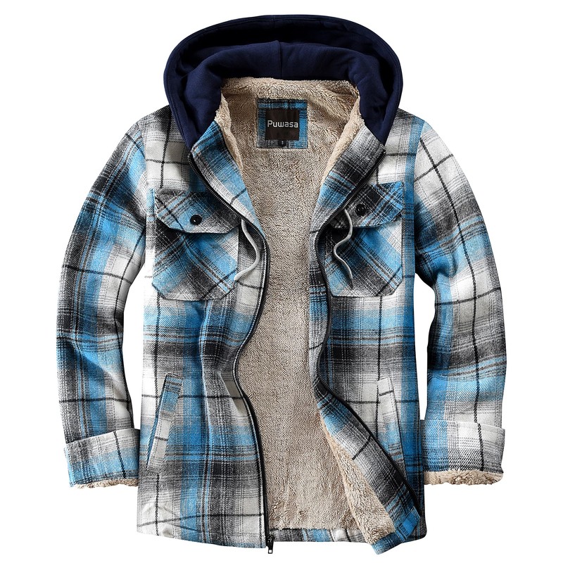Puwasa Men's Full Zip Sherpa Lined Flannel Jacket Fleece Hooded Plaid Jacket with Hood for Men Blue Small