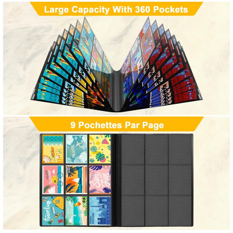 - Portfolio folder card holder 360: 20 pages, 18 compartments per page, space for 360 cards. 10 x 7 cm pockets are compatible with Pokemon, TCG cards, baseball cards, Yugioh cards, football cards, MTG cards, mini Polaroids, Ultra Pro cards and more.