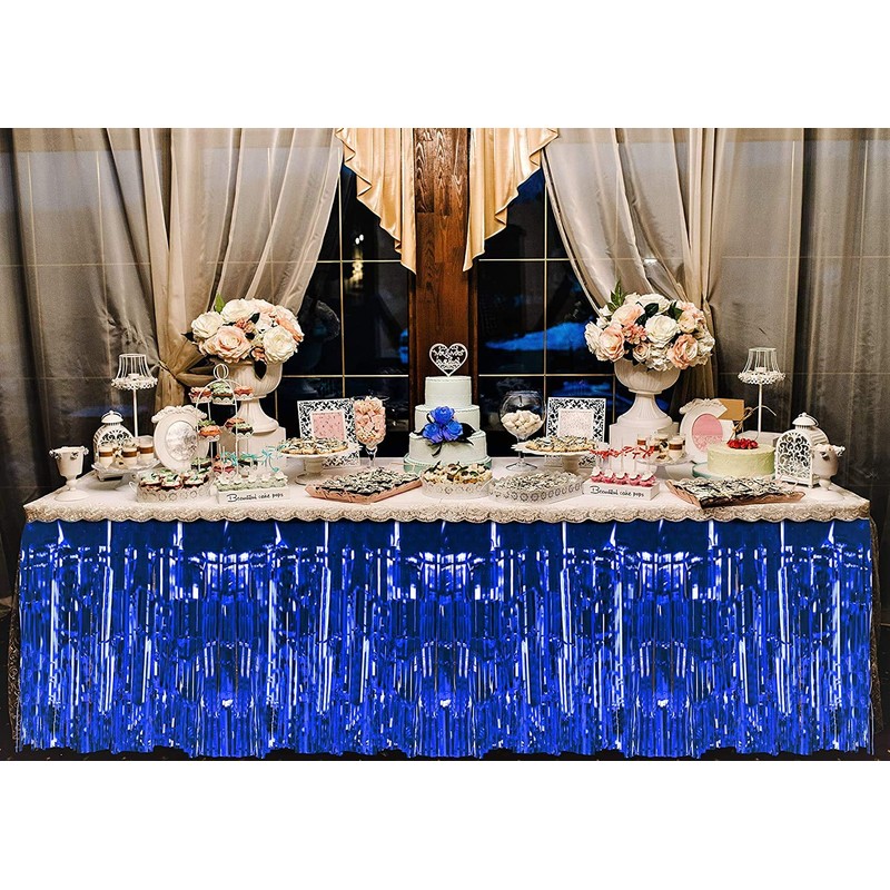 PUZINE 2 Pack Metallic Foil Fringe Table Skirt Tinsel Party Table Skirt Banner for Parade Floats Mardi Gras Party Decoration(L108 inH 29in) (Blue, 2pack)