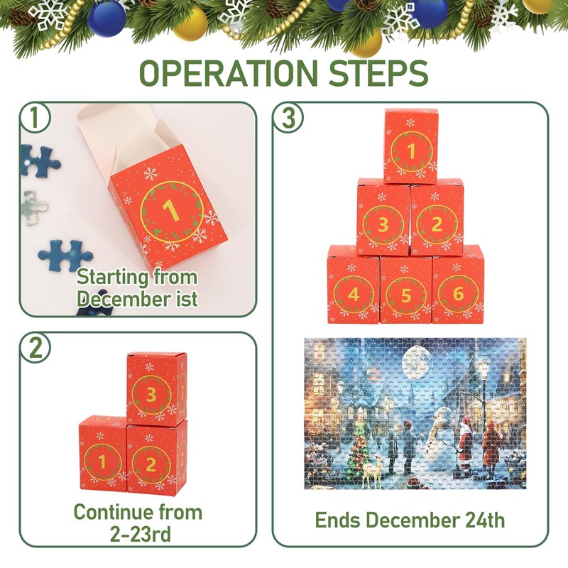 1. Adventskalender puzzle enthält 24 puzzle-boxen. Vom 1. bis 24. dezember können sie jeden tag eine box öffnen und sich so auf jeden tag des countdowns freuen.