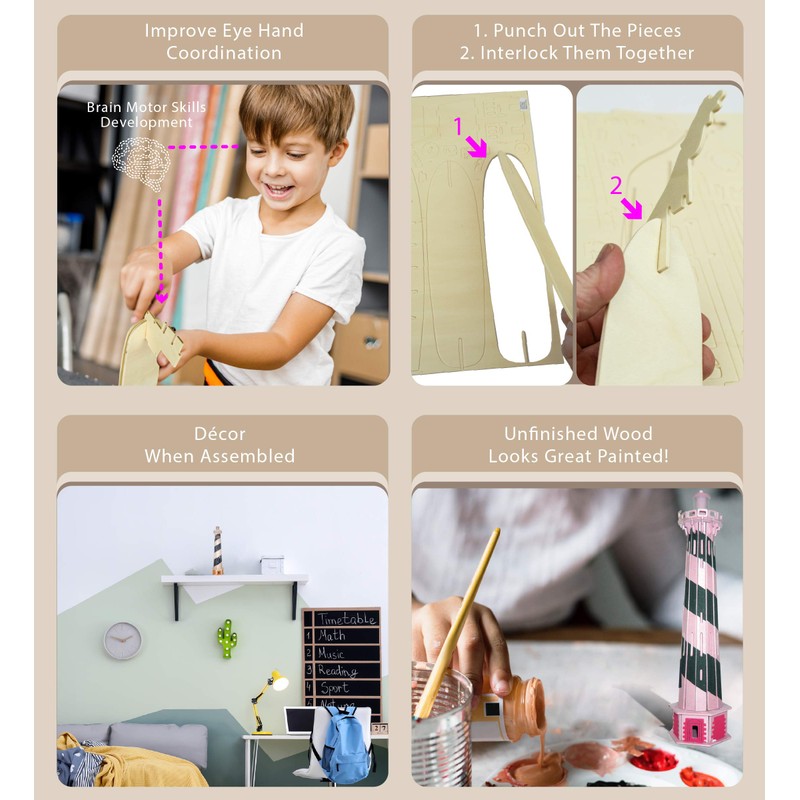 - THE LIGHTHOUSE SET DIY 3D PUZZLE IS FOR ANYONE WHO LOVES PUZZLES - The Lighthouse 3D craft kit is a model to build for kids who love using their brain and create something with their hands. Puzzle lovers will enjoy building this amazing 58 pieces wood toy kit and paint the 3D wood puzzle to make it their own. It is a great father and son bonding project, for school projects or a get together craft play time with friends and family.