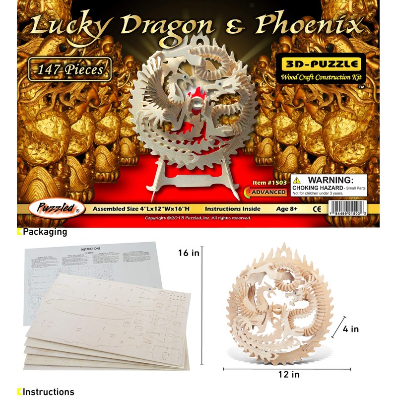 - INCLUDED WITH THE PURCHASE OF 3D LUCKY DRAGON & PHOENIX WOODEN PUZZLE KIT - Includes 1 Lucky Dragon & Phoenix 3D beautiful Puzzle Wood Craft Construction Kit with 147 interlocking puzzle pieces, an instruction manual & 1 paper for sanding edges. 3D Puzzles never looked so good! The unfinished natural wood can be painted or colored for a personalized look. In most parts no glue is needed & the pieces interlock together. Wooden puzzle assembly size is 4''Lx12''Wx16''H. Paint & glue not included.