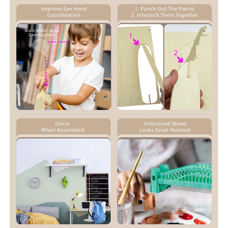 - THE SYDNEY BRIDGE SET DIY 3D PUZZLE IS FOR ANYONE WHO LOVES PUZZLES - The Sydney Bridge 3D craft kit is a model to build for kids & adults who love using their brain & create something with their hands. Puzzle lovers will enjoy building this amazing 55 pieces wood toy kit and paint the 3d wood puzzle to make it their own. It is a great father and son bonding project, for school projects or a get together craft play time with friends and family.
