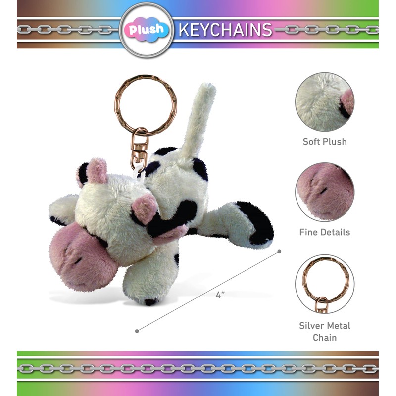 - HIGH-QUALITY PLUSH KEY CHAIN ACCESSORY – Cow plush keychain is made of 100% polyester materials, guaranteed strong and durable. The fluffy plush adds softness to the cute novelty plush. Stuffed with high-quality polyester soft fillings, to ensure the plush keychain will stay in its perfect 3D-shaped cow figure. The cute charm comes with a sturdy metal ring keyholder that is easy to attach and can secure multiple keys.