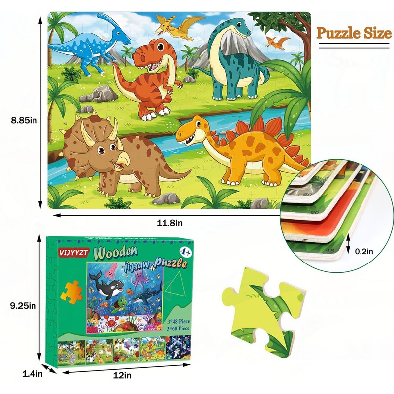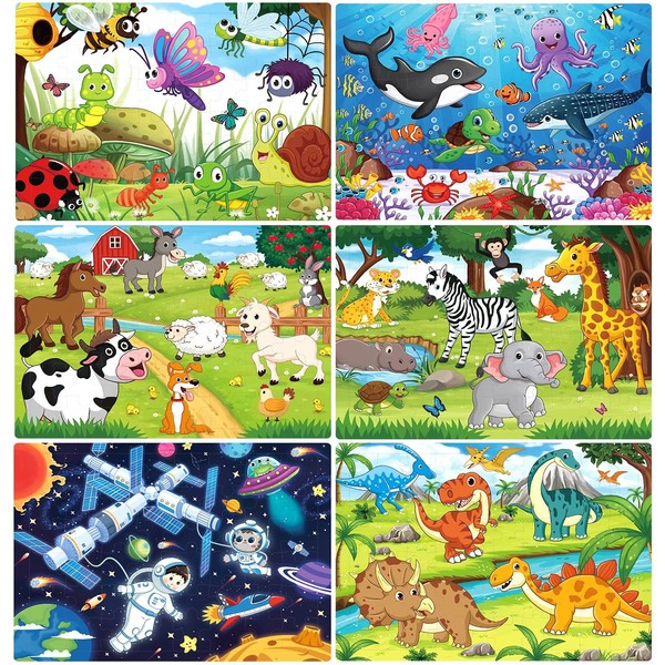 - Fun Wooden Puzzles for Kids: The Wooden Animal Puzzle set features 48-30 pieces wooden jigsaw From simple to complex display 6 different appealing themes when assembled.Included Under the sea, dinosaur, safari, insect, farm, Space. All of them are packed in a colored box.