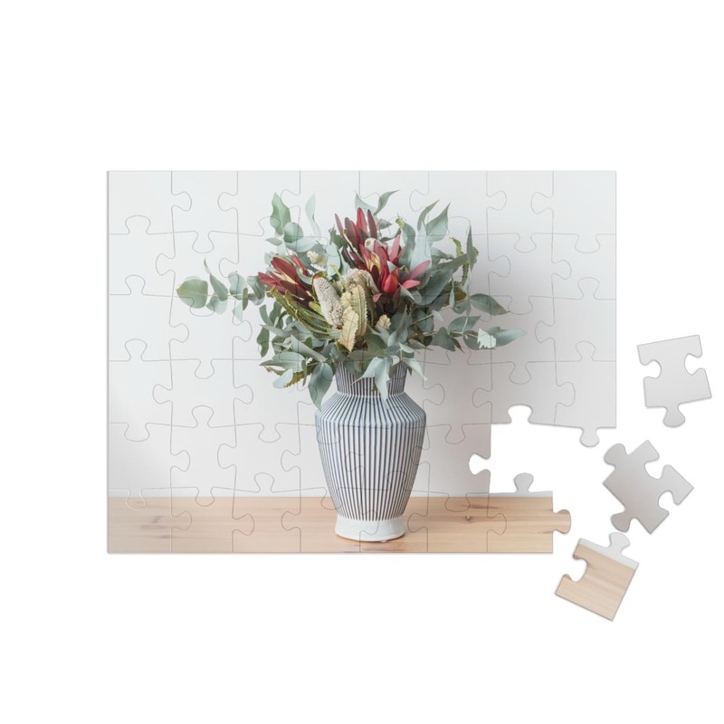 puzzleYOU: 48 Piece Puzzle "Flowers from Australia in a Bouquet: Banksia, Silvan Reds and Eucalyptus Leaves" - From the Puzzle Collection Flower Vases, Flowers & Plants
