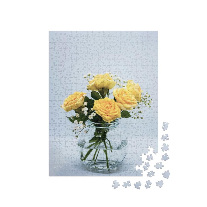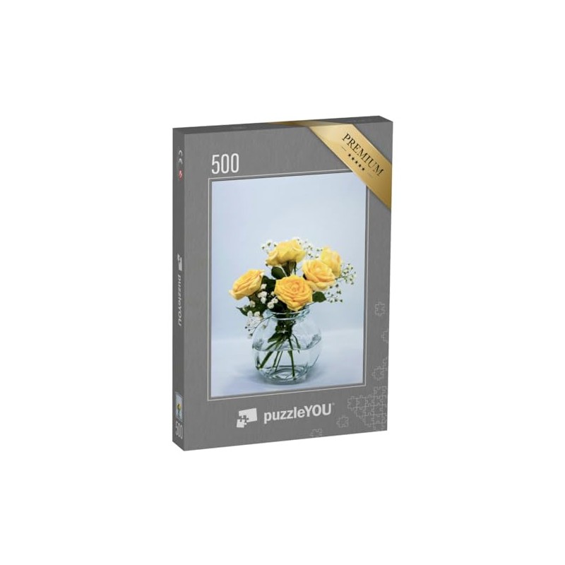 puzzleYOU: Puzzle 500 Teile „Pfirsichrosen und weiße Schleierkrautblüten in Einer Vase auf weißem Hintergrund“ – aus der Puzzle-Kollektion Blumenvasen, Blumen & Pflanzen
