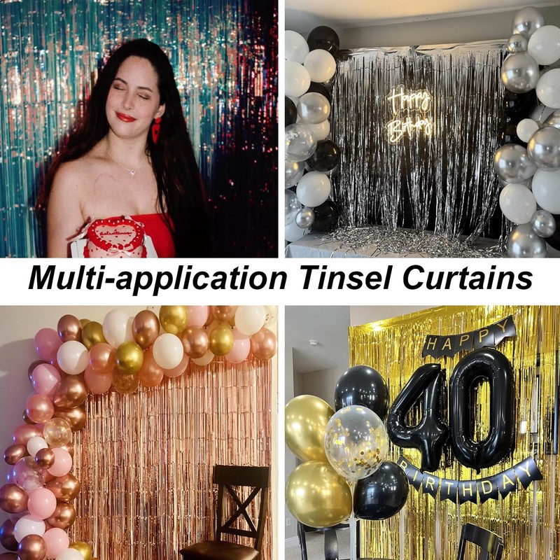 • The King of cost performance: There are 4pcs tinsel curtains foil decorations streamers,3.3ft x 8.3ft for each foil curtain,let you have sufficient decorations to embellish your party and become the core of the party.