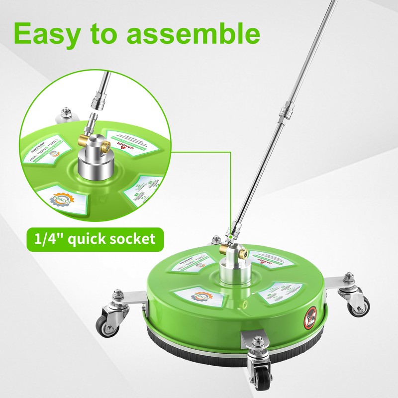 - Simple Setup and Compatibility: The 14 inch high pressure washer surface cleaner includes a 1/4" quick connect fitting for easy attachment to most gas and electric pressure washers rated from 2000 to 4000 PSI. The power washer scrubber attachment comes complete with two extension wands and replacement nozzles, providing everything you need for optimal cleaning performance.