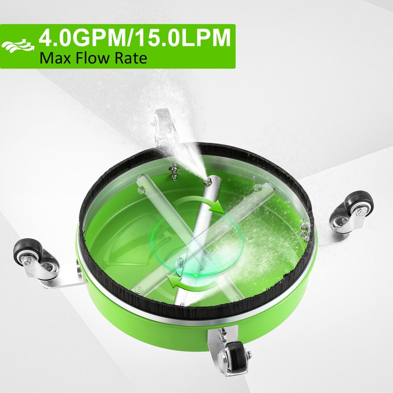 - Enhanced Mobility with Wheels: Featuring four universal wheels, this power washer surface cleaner is easy to maneuver across various surfaces. The mobile design allows for effortless operation, helping you clean large areas quickly and efficiently, while tough bristles prevent water splash and protect adjacent surfaces.