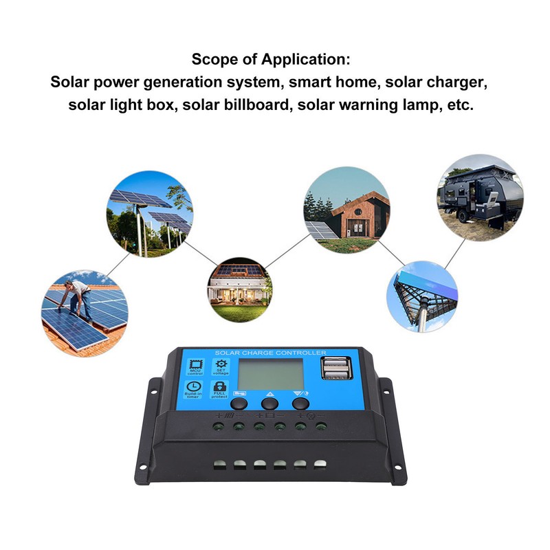1、LCD DISPLAY: Display charge and discharge current, cumulative power generation and discharge power query, temperature display, light control delay control, etc. 2、CHARGE PARAMETERS: Support dual USB output, the maximum current is 2.5A, and adopt 2 way MOS tube anti backflow circuit, with high power charging mode. 3、CIRCUIT PROTECTION: Built in overheating, overcurrent, short circuit, open circuit, reverse connection protection, troubleshooting, controller automatic recovery function. 4、EASY OPERATION: The PWM solar panel controller is easy to set and operate, the control parameters are adjustable, and it has a power off memory function. 5、HIGH EFFICIENCY: The current auto focus PWM tracking charging, high charging efficiency, the charging process does not stop detection, dual way focus tracking.