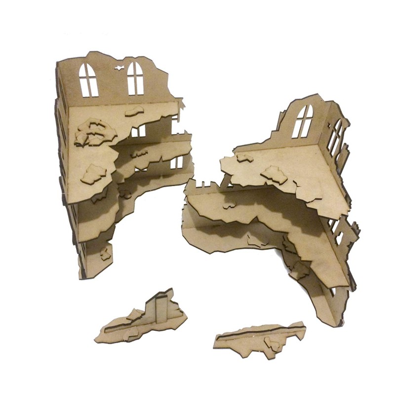 Urban Ruins Scenery War Game Set ideal for mini games in scale 28mm - 35mm. The kit contains 4 terrains - scenic elements made of 3 mm MDF for assembly and painting. Assemble the latch with PVA glue and paint with acrylic paints. All products of the Urban Ruins sets are compatible with each other. MDF Terrain Scenery - Urban Ruins 02 - Set contents: 2 x 3-storey buildings (dimensions 20 x 20.5 x 24 cm) - 2 x small ruins (dimensions 12.5 x 4 x 8 cm and 12.5 x 4.5 x 1.5 cm). These scenic elements are quick and easy to assemble and with many three-dimensional details. . They meet the game table with an excellent value for money. Recommended for sci-fi war games, battle games, warhammer 40k, infinity, bolt action, kings of war, kill team, Marvel Crisis protocoll … All thumbnails in images are for illustration purposes only.