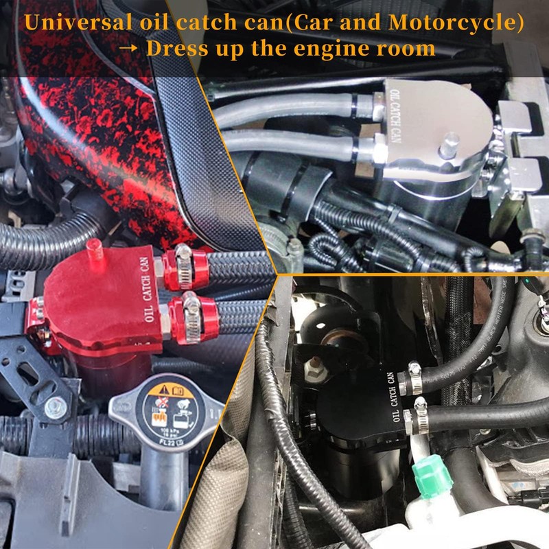 - Universal Design and Package: Ideal for both vehicles and motorcycles, this catch can with 3 pairs of adapters (6mm 8mm 10mm) meets all your needs (As long as the space allows) .