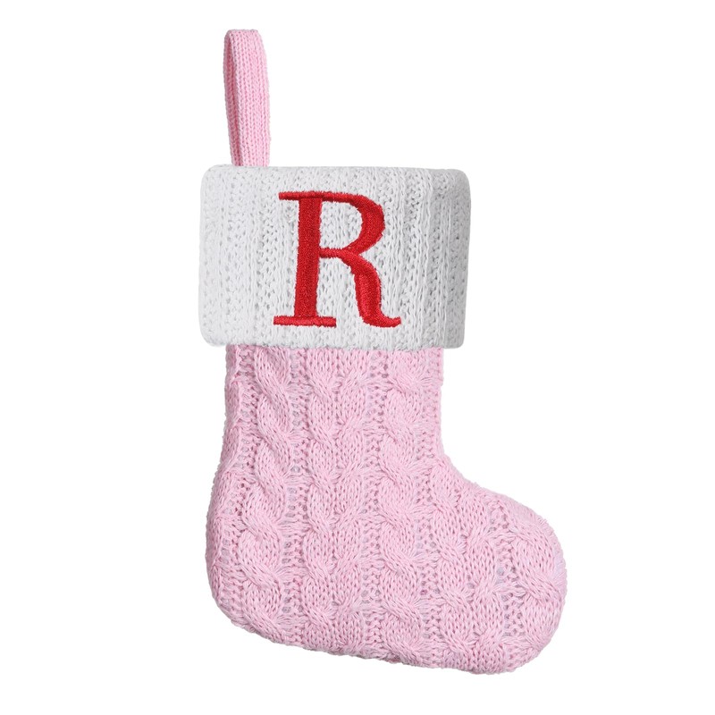 Pxniy Mini Pink Knit Stocking,8.5 Inches Initial Monogram Embroidered Christmas Stocking,Family Fireplace Hanging Ornament Xmas Holiday Decor Gift-Letter R