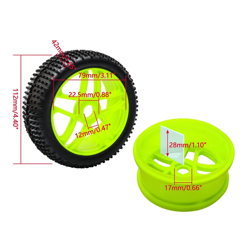 - Size: Tyres Outer Diameter: 112 mm; Tyres Wide:43m; Hexagonal joints: 17 mm. Color:Black+Green