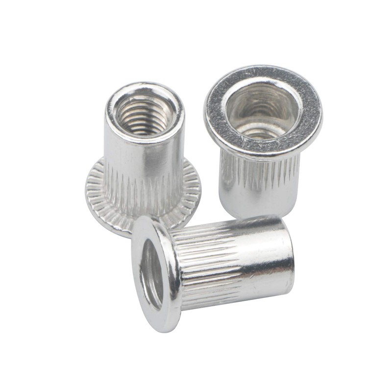 - Rivet nuts are knurled and have vertical stripes on the surface, which makes them easier to tighten and loosen. They also have good friction and bite, the workpiece cannot slip easily, and they are easy to install on a variety of different materials such as steel, plastic, fibreglass, etc.