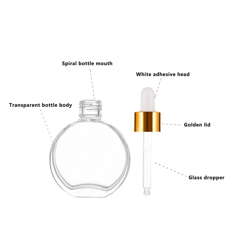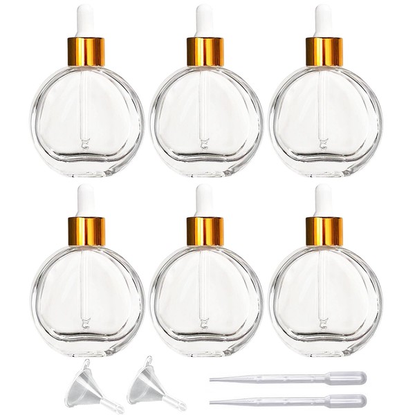 - Package Includes:6 clear glass flat round bottles, glass droppers, and gold caps set, with 2 funnels, 2 pipettes, and 6pcs labels to that will allow you to effectively organize and store all your essential.