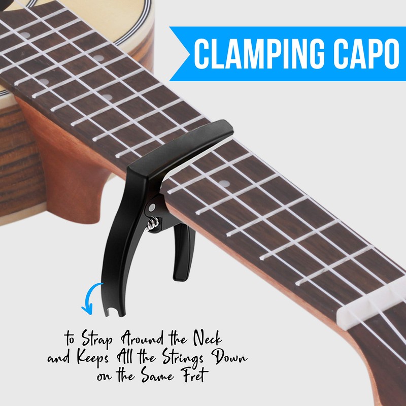 - CAPO: The package also includes a ukulele capotasto or capo to strap around the neck and keep all the strings down on the same fret. It is a small device that clamps onto the neck of a guitar and shortens the length of the strings, raising their pitch