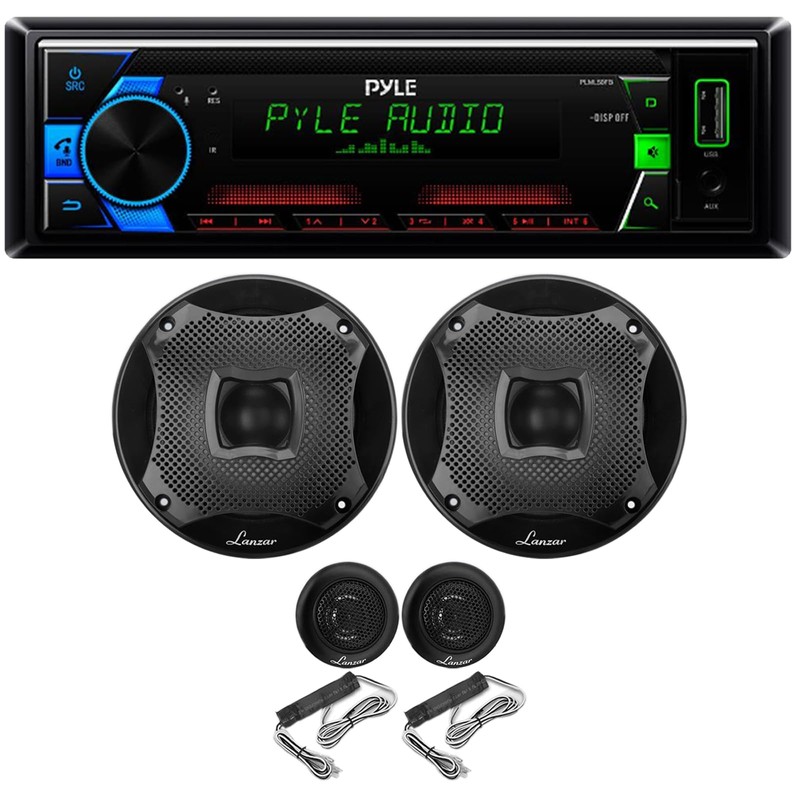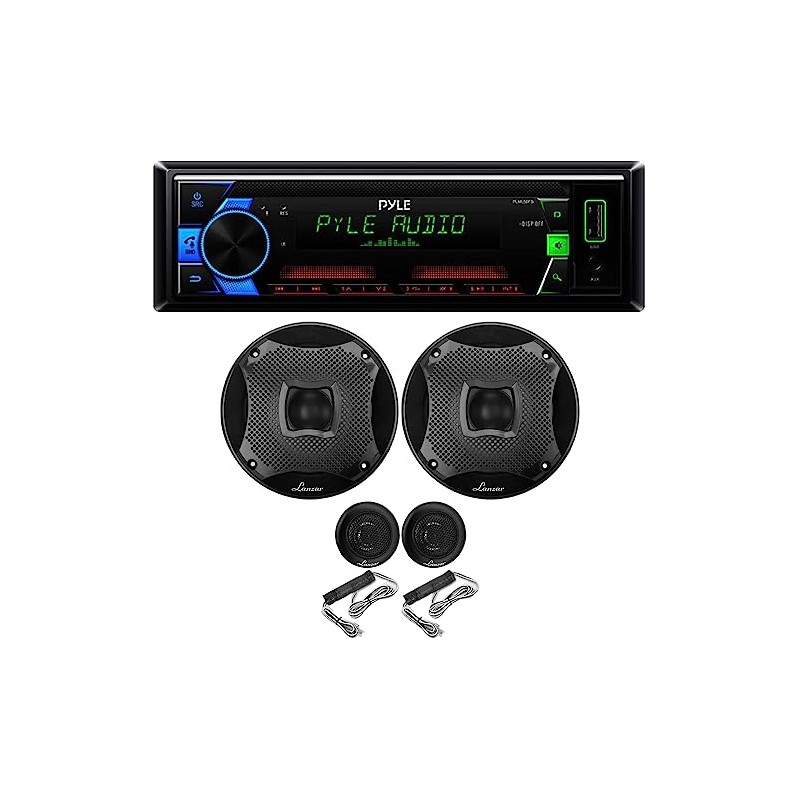 - PACKAGE BUNDLE INCLUDES: 1x Pyle PLML50FB Single DIN Bluetooth USB/AUX AM/FM Radio Stereo MP3 Car Audio Receiver, 2x Lanzar AQ65.2CMB 6.5" 450 Watt Peak Power 2-Way Black Audio Component Speakers.