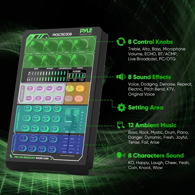 - SOUND CARD FEATURES: The sound card has 8 sound effects and 12 ambient music for you to choose from. It also has 8 control knobs for you to adjust your audio & tone to your liking. It also has a monitor control fader & battery power indicator lights