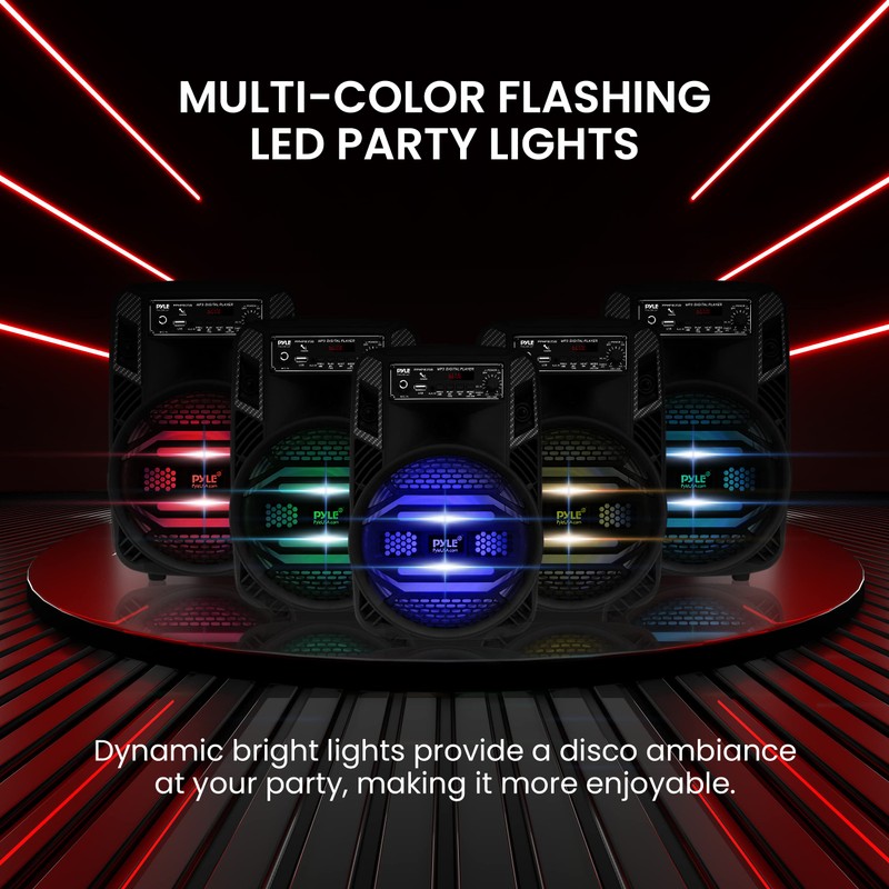 Pyle Portable Bluetooth PA Speaker System - 300W Rechargeable Outdoor Bluetooth Speaker Portable PA System w/ 8” Subwoofer 1” Tweeter, Microphone In, Party Lights, MP3/USB, Radio, Remote -PPHP835B