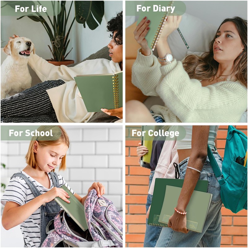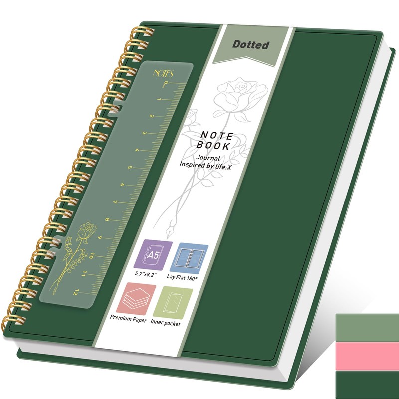 PYNEX Notebook A5 Dot Pattern, Bullet Dotted Journal, Spiral Notebook, 160 Sheets/80 Pages for Writing, 100 gsm, with Bookmark, Ruler, Inner Compartment and Thick 14.5 x 21 cm, Dark Green