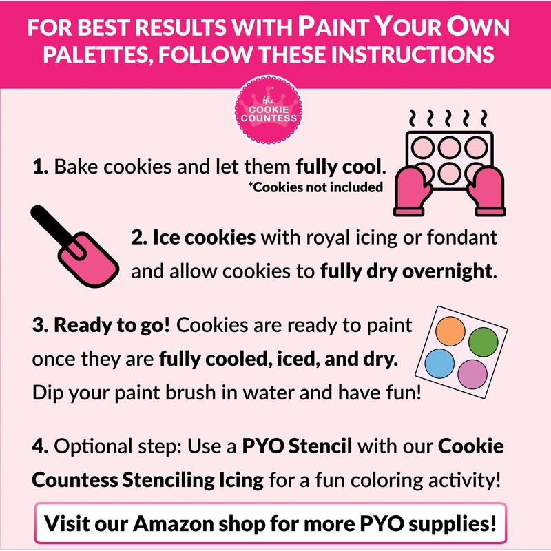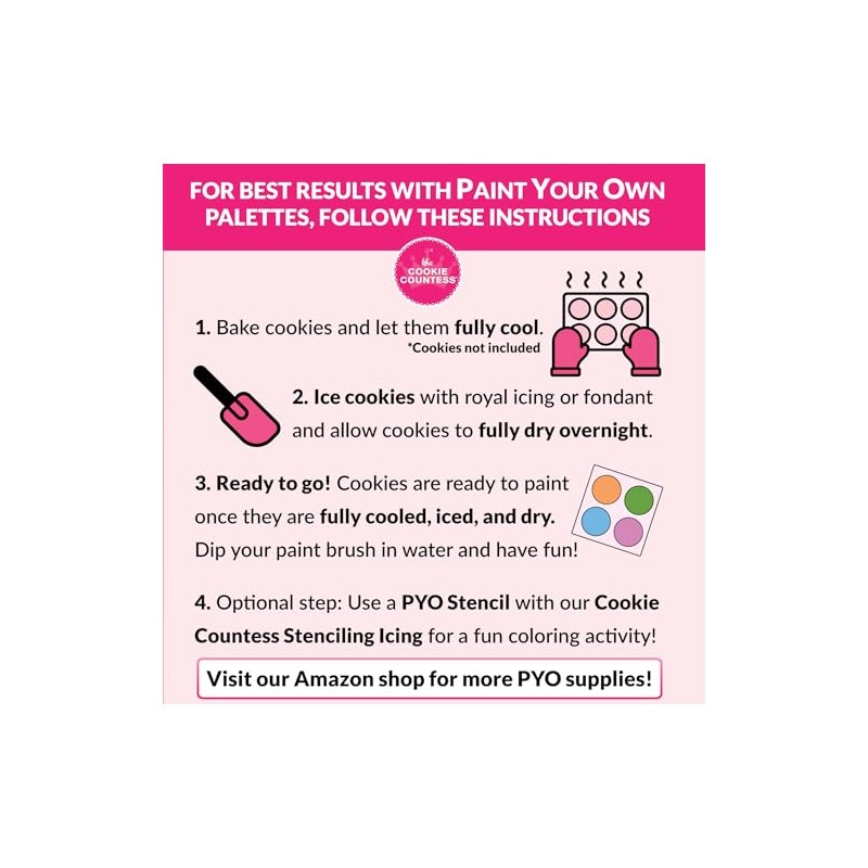 - Edible Paint Palette for Paint Your Own Cookie: Works best on Royal Icing or Fondant