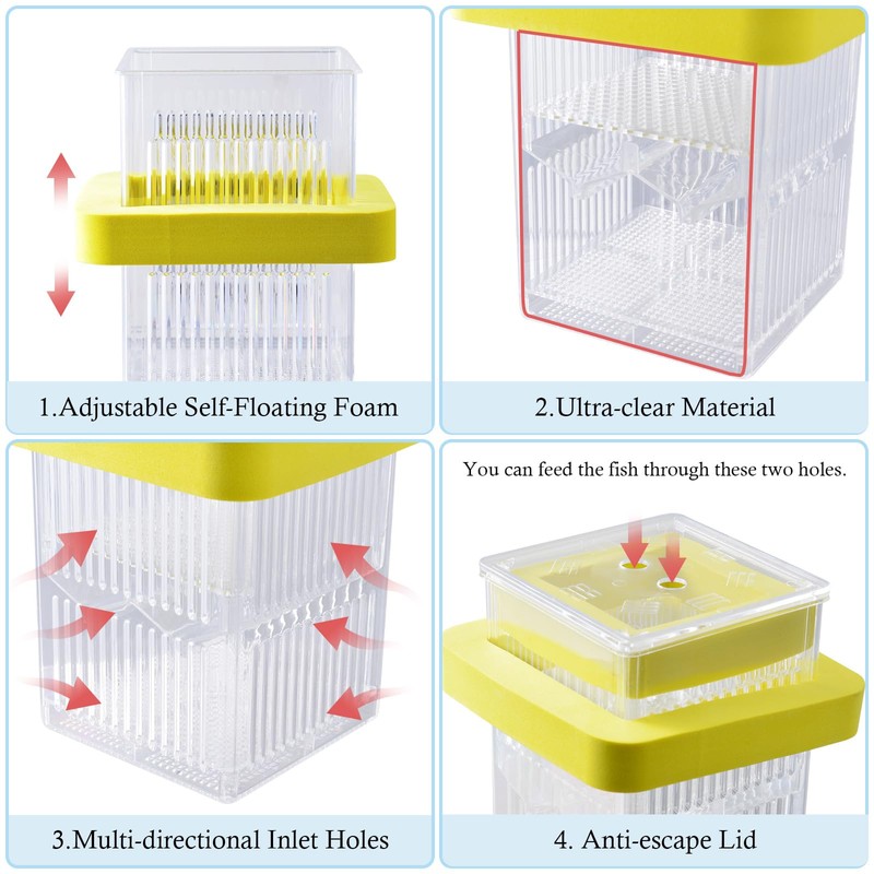 • 【Self-floating Design】Equipped with a floating foam circle, the breeding box can float effortlessly on the water surface of the fish tank. No additional suction cups need to be installed. The dividers with holes allow free flow of water to keep oxygen levels up.