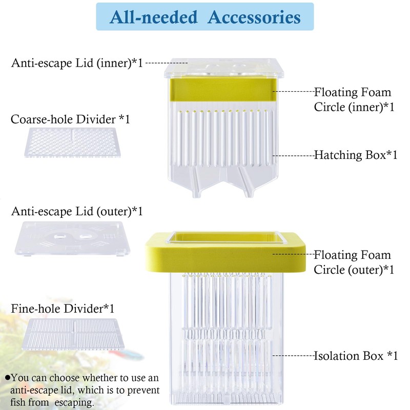 • 【All-needed Accessories】The fish tank breeding tank includes all the needed accessories: Hatching box*1 , Isolation Box *1, Coarse-hole Divider *1, Fine-hole Divider*1, Floating Foam Circle (inner)*1, Floating Foam Circle (outer)*1, Anti-Escape Lid (inner)*1, Anti-Escape Lid (outer)*1.