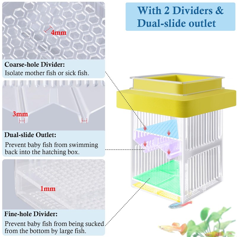 • 【Easy to Use】2 separate boxes : the hatching box and the isolation box, more safety, more usage. Place the mother fish inside the hatching box, when she gives birth, the baby fish can swim through the holes of the divider to the isolation box. Each of the box can also be used as a safe-house for sick fish or to segregate aggressive fish, you can use Anti-Escape Lid to prevent fish from escaping.