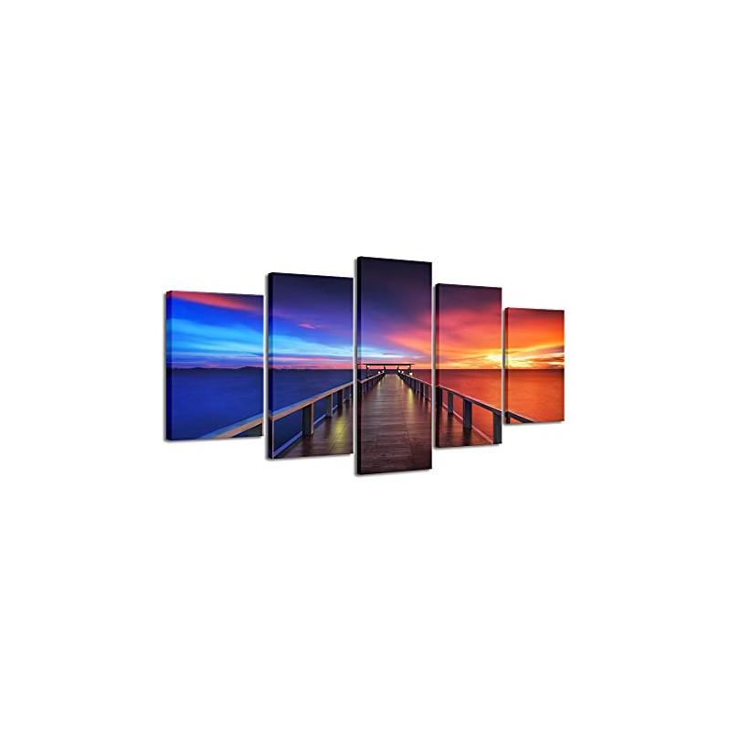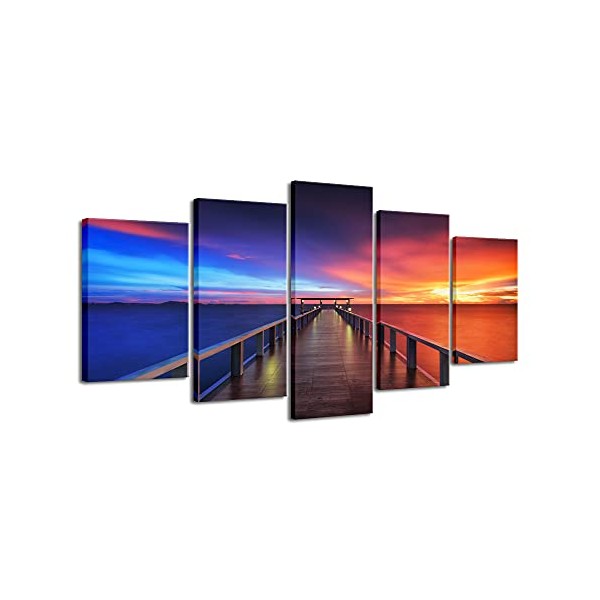Pyradecor Sunset Bridge Extra Large 5 Piece Modern Seascape Artwork Giclee Canvas Prints Stretched and Framed Landscape Sea Beach Pictures Paintings on Canvas Wall Art for Home Decorations XL