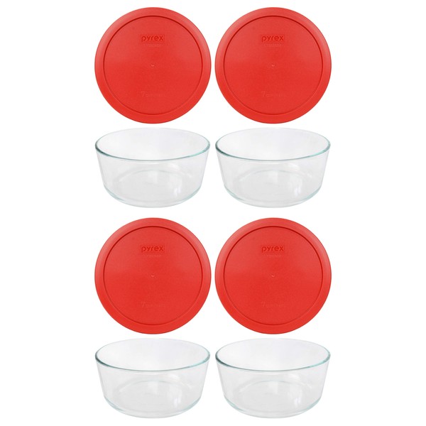 - Included: Pyrex (4) 7203 7 Cup Glass Dishes & (4) Pyrex 7402-PC 6/7 Poppy Red Lids