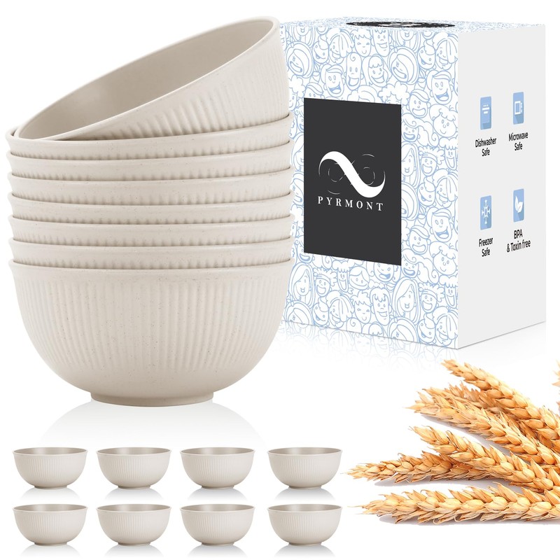 PYRMONT Wheat Straw Bowls 26 OZ Plastic Bowls Reusable, Unbreakable Soup Bowls, Bowl Set of 8, Cereal Bowl, Small Bowls for Kitchen, Dishwasher & Microwave Safe Bowls, BPA-Free (Beige)