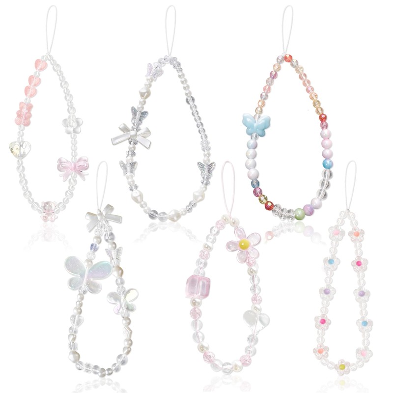PYSEOSISE Beaded Phone Charm, 6 Pcs Beaded Phone Wrist Strap, Butterfly and Flowers Cellphone Lanyard Universal Wrist Lanyard for Women Camera Key Purse Bag Decoration