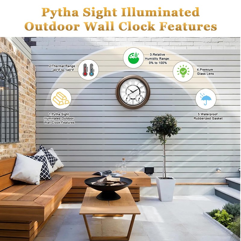 - 【Extensive Application To Any Outdoor & Indoor Space】Pytha Sight outdoor clock is a perfect blend of style and functionality.The elegant frame and LED illuminates make it a stunning focal point on your patio.The outdoor wall clocks waterproof adds a classic and stylish touch to your living room,entryway, fireplace,bedroom, kitchen, or patio, lawn, garden, backyard, pool,fence,deck,shed,balcony.It's an ideal gift for house warming gift,Mother's Day Gift,Father's Day Gift or Christmas Gifts.