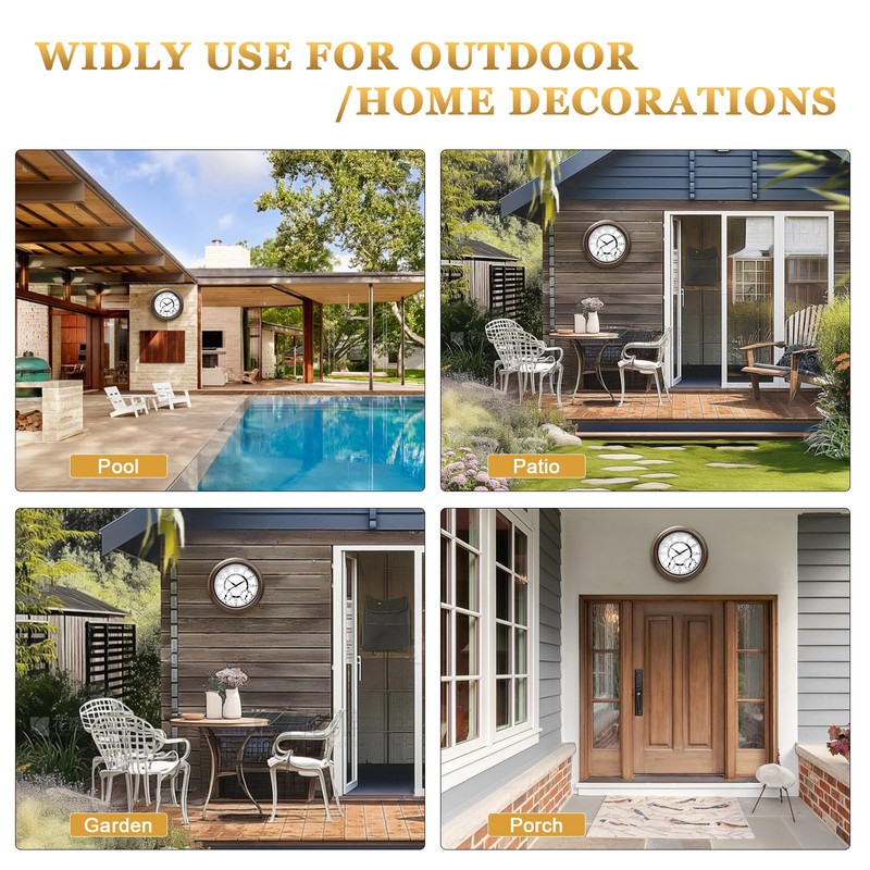 - 【UV-Resistant &Waterproof】Our large outdoor patio clocks is designed to withstand the elements, featuring UV resistance and waterproof protection with a rubber gasket seal.The durable metal frame, treated with UV-resistant coating, ensures lasting performance and resilience.