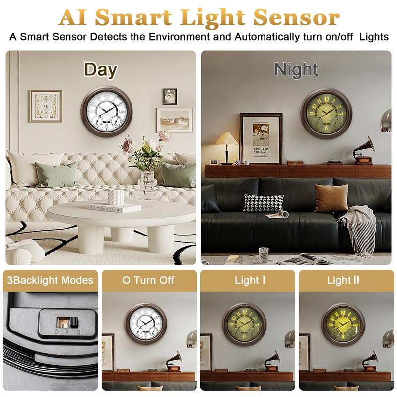 - 【Outdoor Clock with AI Smart LED Illumination Sensor】Pytha Sight outdoor waterproof clocks 18 inches, feature a built-in light sensor that automatically illuminates when it gets dark. When the surroundings brighten, the lighting deactivates on its own. Choose between Off, Light I, and Light II for various backlight options.