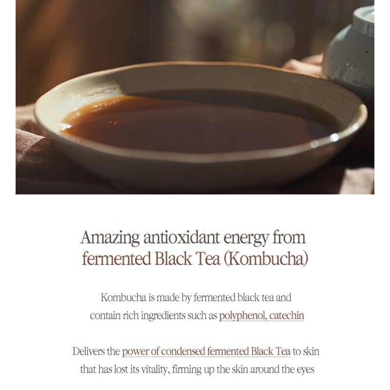 Fermented black teathat is rich of polyphenol and catechin, and anti-aging ingredients provideelasticity and deep wrinkle care to the dull and sagging under eye area. Anti-oxidantenergy of fermented Black Tea. Anti-wrinkle & Skin brightening with Peptideand Adenosine. Intensive care with nutrition & moisture with Low-molecularCollagen and Black Soybean Extract. Zero irritation certified. Clinically-tested,non-irritating formula that's great for all skin types. Can also be used abovethe eyebrow and around the mouth. Cruelty-free and no animal testing.