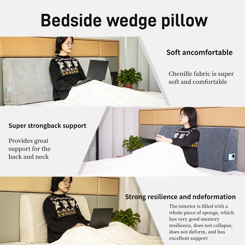 - 【Design】: The wedge headboard pillow adopts a wide bottom and narrow top arc design, which can provide excellent support no matter what posture you lean on it. Our wedge headboard pillow is designed with two capacity pockets on both sides, which can be used to place items such as mobile phones and remote controls.