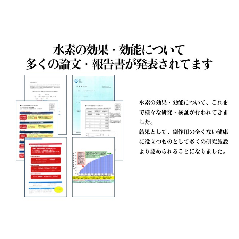 - 水と反応し体内で水素が発生するため、水素水などように揮発して成分がなくなる心配がございません。また、最大8時間も水素が生成さ続けるため、1回のお召し上がりで長時間効果を実感できます。