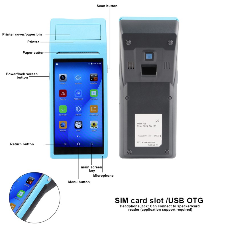 1、For Android 8.1.0 operating system, quad‑core CPU, 8GB Nand Flash; 5.5‑inch IPS display with 1W speaker, it can be heard clearly in noisy environment. Support 3G, WIFI, BT3.0 / 4.0, for iBeacon. It can run 10 applications at the same time. 2、Built‑in 58mm thermal printer. High‑speed POS printer for printing anywhere, anytime. Suitable for restaurants, street vendors, outdoor dining, gas stations, etc. Let you collect and print your receipt immediately. 3、5000mAh super rechargeable battery. 48 hours of continuous operation, 30 days of standby time, 5000 orders for full power printing. It's easy to get through the day's work. It also supports flash charging. You don't have to worry about your work being in 4、Use the camera to read the barcode that can identify the QR code within 0.1 seconds. Have a laser barcode scanner. Support for OTG for mobile barcode scanners, adapters and USB drives, adding versatility to meet every need. 5、98% of for Android apps are compatible.