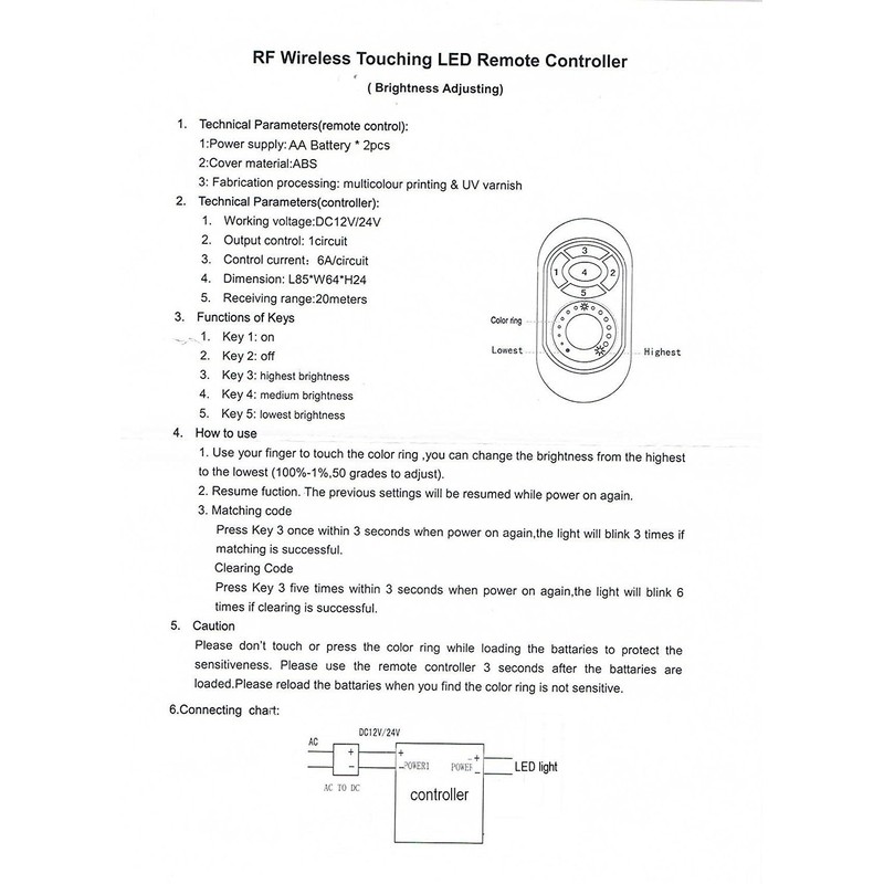 - Touch + keys controller, Long radio receiving distance about 10M;